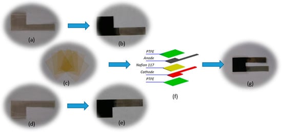 The preparation of titanium mesh-based MEA mainly includes titanium mesh pretreatment [26,27], Nafion 117 membrane pretreatment [28], cathode preparation [18], anode preparation [18], and MEA hot-pressing [13,14,15]. A typical process flow photo is shown in Figure 2.
