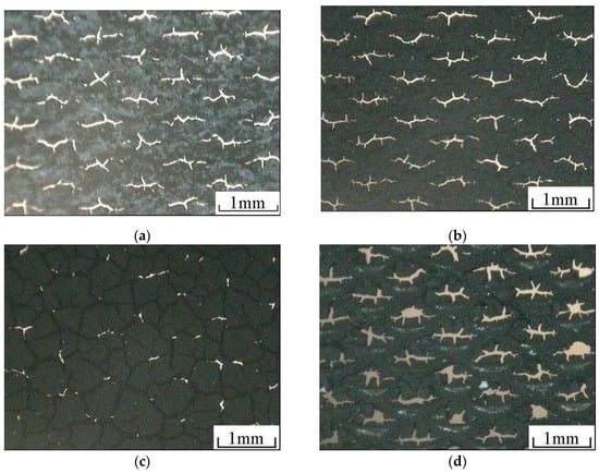 First, the titanium mesh is treated with 0.5 mol·L−1 sulfuric acid solution at 80 °C for 30 min; then, it is ultrasonically cleaned twice with deionized water for 30 min each. Then, the treated titanium mesh is placed in deionized water for use. This process mainly removes impurities on the surface of the titanium mesh. Figure 2a,d show the photos of the prepared electrode-supported titanium mesh.