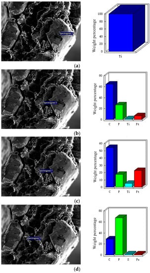 Figure 8 is the EDX analysis diagram of each layer in the cross-section of titanium mesh-based MEA. It can be observed from the figure that the EDX analysis results of each point are consistent with the reagent formula of each layer. Figure 8a,f show the EDX point analysis of cathode substrate and anode substrate, respectively, whose results show that the weight percentage of Ti element reaches 100%. Figure 8b shows the EDX point analysis of the cathode gas diffusion layer, whose results demonstrate that it mainly contains the elements C and F, which are the elements contained in the two significant reagents, XC-72 carbon and PTFE, of the catalytic layer. At the same time, it contains a small amount of Pt, which indicates that the cathode catalyst and the gas diffusion layer are fused, which is caused by the existence of holes in the gas diffusion layer in Figure 5b above. Figure 8c shows the EDX point analysis of the cathode catalytic layer, whose results demonstrate that it mainly contains C, F, and Pt elements. F is the element introduced into the cathode gas diffusion layer, and Pt is the main element of the cathode catalyst. Figure 8d shows the EDX point analysis of the Nafion 117 membrane, whose results demonstrate that it mainly contains C, F, and S elements, which is consistent with the material properties. Figure 8e shows the EDX point analysis of the anode catalytic layer, whose results show that the weight percentage of C, Pt, and Ru elements is the same as that in the anode catalyst, PtRu/XC-72R. At the same time, it also shows that there are F and O elements, indicating that the anode catalyst has been partially embedded in the Nafion 117 membrane [31,34].