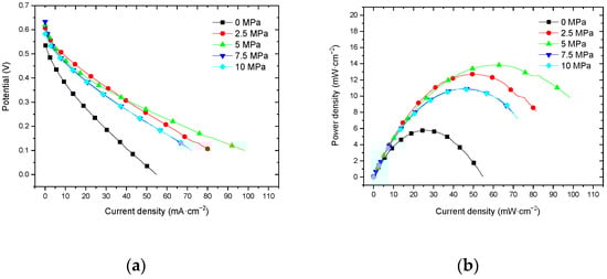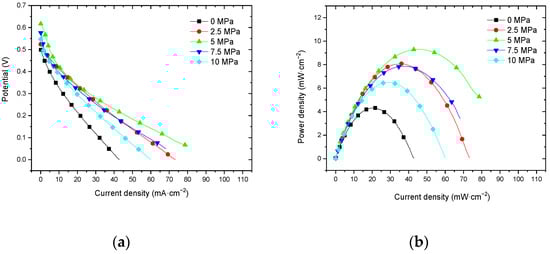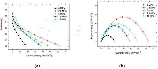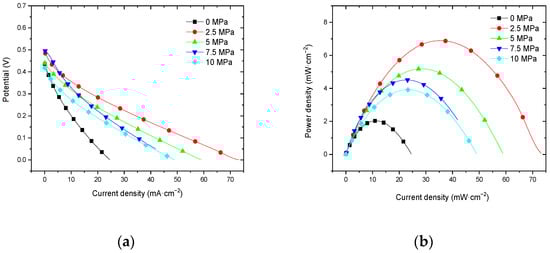 Comparing Figure 9, Figure 10, Figure 19 and Figure 20, it can be found that under room temperature, whether the cathode oxidant is self-breathing air or 100 mL·min−1 oxygen of 0.1 MPa, the influence of hot-pressing pressure on the polarization performance of titanium mesh-based MEA shows a consistent regularity. That is, when the hot-pressing pressure gradually increases from 0 MPa to 2.5 MPa, the peak power density of titanium mesh-based MEA gradually increases. When the hot-pressing pressure gradually increases from 2.5 MPa to 10 MPa, the peak power density of titanium mesh-based MEA gradually decreases. The results demonstrate that the titanium mesh-based MEA with a hot-pressing pressure of 2.5 MPa at room temperature is better than that of titanium mesh-based MEA under other hot-pressing pressure conditions. In addition, the performance of the titanium mesh-based MEA is better than the data reported in the latest literature [37], whose peak power density is 1.67 mW·cm−2 at room temperature and air-breathing.