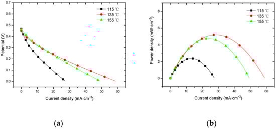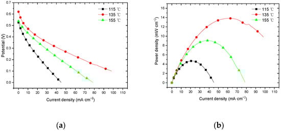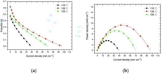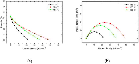 Figure 16 shows the curve of the effect of the hot-pressing temperature on the performance of titanium mesh-based MEA at 25 °C and atmospheric pressure with 100 mL·min−1 oxygen of 0.1 MPa as the cathode oxidant and a 1 mol·L−1 methanol + 0.5 mol·L−1 sulfuric acid aqueous solution as the anode electrolyte. It can be observed from the figure that the peak power density of titanium mesh-based MEA with the hot-pressing temperature of 135 °C is the largest. Its maximum value is 13.83 mW·cm−2, which is 2.96 times the MEA peak power density of 4.68 mW·cm−2 at 115 °C and 1.53 times the MEA peak power density of 9.06 mW·cm−2 at 155 °C.