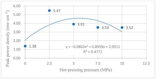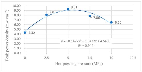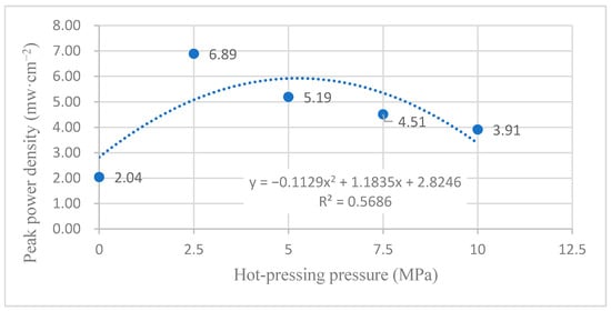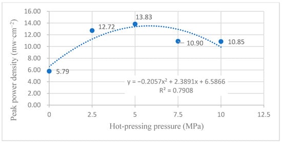 According to the experimental data of Figure 9 and the polynomial fitting method [36], the fitting between the peak power density and the hot-pressing pressure under room temperature and air conditions is performed to obtain the fitting diagram and polynomial formula, as shown in Figure 19 and Equation (5):