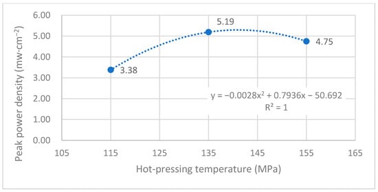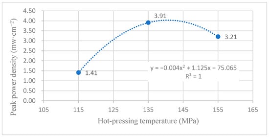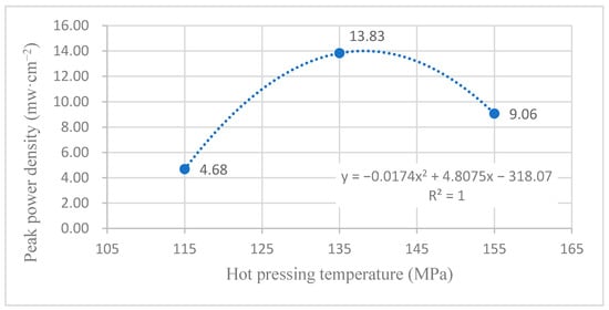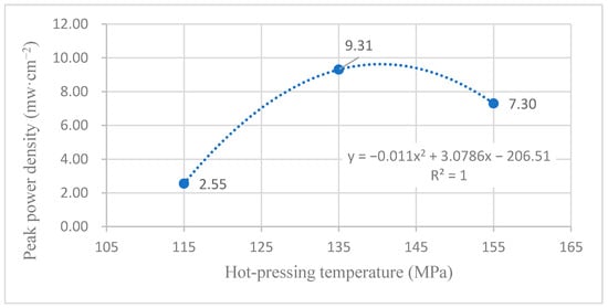 According to the experimental data of Figure 13 and the polynomial fitting method [36], the fitting between the peak power density and the hot-pressing temperature under room temperature and air conditions is performed to obtain the fitting diagram and polynomial formula, as shown in Figure 23 and Equation (13):