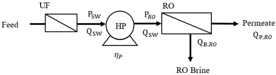 A schematic diagram of the stand-alone RO process is shown in Figure 1. Since the suspended particles, microbes, and organic and inorganic matter in seawater can block the RO membrane and lead to fouling, the raw seawater feed solution is often pretreated with UF/MF prior to RO. The SEC for pretreatment per unit of RO permeate (SECPre) is described in Equation (2).