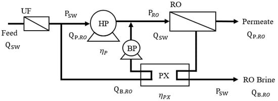 The RO-ERD process is presented in Figure 2. ERD is utilized to recover the remaining mechanical energy in the brine solution; herein, a PX was selected as the ERD. After seawater pretreatment, part of the feed solution enters the RO unit via HP, and the other part enters the RO unit via the PX and booster pump (BP). The brine solution is then discharged after the available brine energy is transferred via the PX at atmospheric pressure. The SEC of the RO-ERD process (SECRO-ERD) can be calculated as in Equation (5) [2,3]: