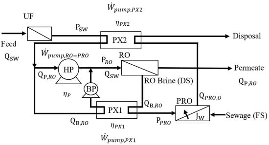 where QB,RO is the RO brine flow rate. The recovery of mechanical energy at the PRO DS outlet after depressurization from PPRO to atmospheric pressure via PX2 () can be evaluated by Equation (10).