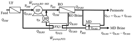 Figure 4 illustrates the RO-MD process. RO brine is first depressurized to PMD via PX3 and then transported to the MD unit. The SEC of RO-MD () and the mechanical energy recovered via PX3 () can be presented by Equations (12) and (13), respectively.