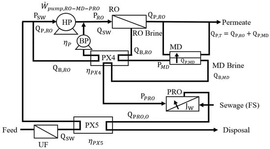The power density of PRO can be enhanced by increasing the DS concentration; therefore, utilizing the high-concentration RO-MD brine discharge as the PRO DS can improve power production. Figure 5 is the schematic diagram of the integrated RO-MD-PRO process. MD brine is pressurized in the PRO unit as the DS. It is assumed that PRO DS will be diluted to the initial seawater concentration and that the mechanical energy will be transferred to the RO feed solution via PX5. The SEC of RO-MD-PRO () and the recovery mechanical energy from PX4 () can be expressed as shown in Equations (17) and (18).