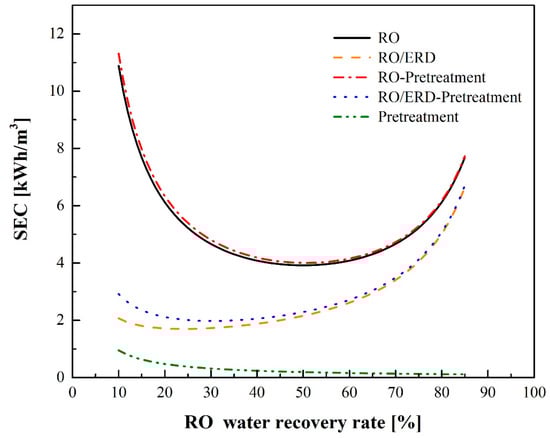 Comparison of SEC between the stand-alone RO and RO-ERD processes simulated with and without pretreatment.