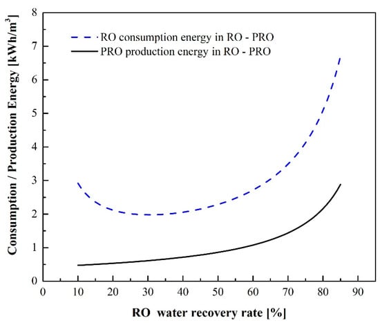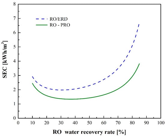- For the RO-PRO process, SEC reaches a minimum value of 1.33 kWh/m3 at a recovery rate of 38%. RO-PRO can give a lower SEC than RO due to the energy generation by PRO, and a higher water recovery rate is obtained at the minimum SEC.