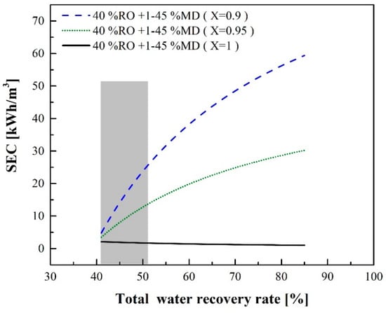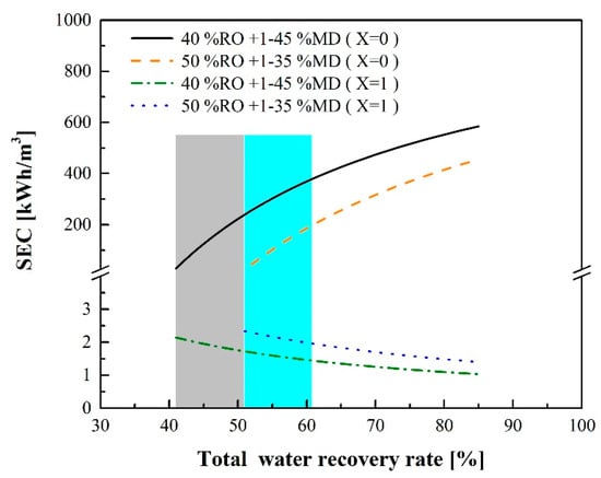 Figure 9 indicates that waste heat can largely influence SECRO-MD. If there is not sufficient waste heat supply, electricity, steam or other heat sources should be provided for the MD process. Figure 10 shows the relationship between the total water recovery rate and SECRO-MD at different percentages of the waste heat supply when the RO water recovery rate is 40%. If the waste heat could provide 90% or 95% of the required heating energy (X = 0.9 or 0.95), SECRO-MD could be reduced to 25.5 or 13.61 kWh/m3, respectively, when the total water recovery rate is 51%.