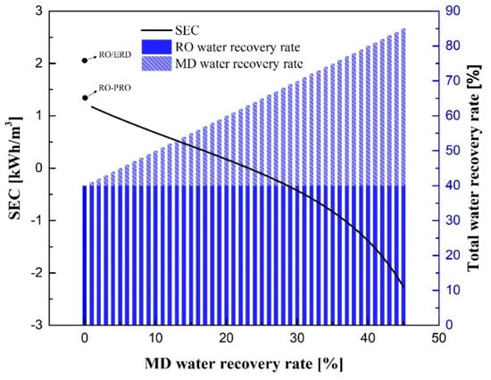 - For the RO-MD process, when the RO water recovery rate remains constant and there is sufficient waste heat as the MD heat source, SEC can be reduced as the MD water recovery rate increases. If the water recovery rate of RO is fixed at 40% and the total water recovery rate is 85%, SEC is 1.03 kWh/m3.