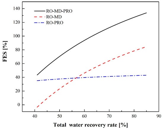 Figure 12 illustrates the FES for different water recovery rates. When the MD heat requirement is totally met by waste heat, the FES of RO-MD, RO-PRO, and RO-MD-PRO increases as the total water recovery rate increases since MD can enhance water recovery and PRO can extract osmotic pressure energy from brine discharge. At the same water production rate, when the water recovery rate increases, the amount of brine will decrease, but the brine concentration will increase. According to Equations (7) and (9), these two phenomena have opposite effects on PRO energy generation. Therefore, the increase in the rate of FES for RO-PRO is lower than that for RO-MD and RO-MD-PRO.