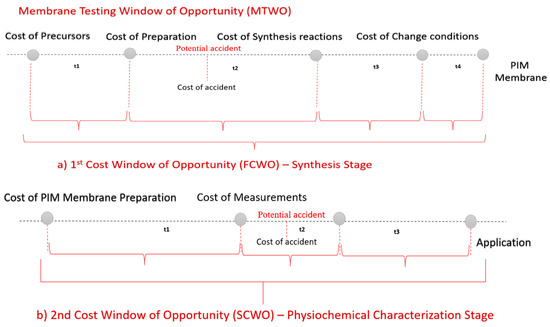 For the purposes of this study, the period starting right before the membrane synthesis and until its actual use, is considered as the best time to control the total cost on a lab scale. The total cost of PIM can be split between the two stages, each one corresponding to a cost window of opportunity (CWO) (Figure 1).