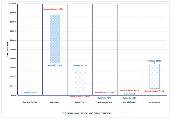 The TCO study concentrated on determining and evaluating the costs related to the synthesis and characterization processes. The discovered cost components were categorized accordingly. To establish the cost profiles of each of the options, the cost savings were considered, including raw material costs, energy costs, labor costs, maintenance costs, depreciation costs and accident costs. Based on the developed model, the total cost of ownership for each factor is presented as a percentage distribution in Figure 4, which allows for a direct comparison of the cost distribution for the PIM, graphically.