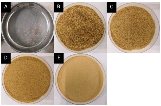 Fiber weight distribution according to mesh size (M. acuminata) of (A) <1 mm = 0.6474 g, (B) 1 mm–500 µm = 26.5757 g, (C) 500 µm–355 µm = 44.7802 g, (D) 355 µm–180 µm = 48.8895 g, (E) <180 µm = 114.6674 g.