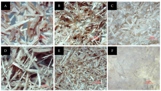 (A) M. acuminata pseudostem after being dried and sieved; (B) after the steam explosion; (C) after the bleaching process; (D) M. balbisiana pseudostem after being dried and sieved; (E) after the steam explosion; (F) after the bleaching process.