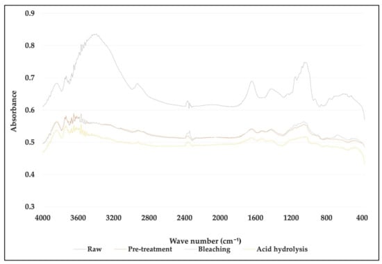 2.5. Composition of Hemicellulose, Cellulose, Lignin, and Extractives of Banana Pseudostem Fibre after Pre-Treatment, Bleaching and Acid Hydrolysis