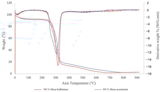 The TGA curves for the M. acuminata and M. balbisiana pseudostem CNFs are shown in Figure 8. Only one degradation step was observed for both materials. The CNF from both sources generally started its decomposition easily, while the weight loss mainly happened at 263–365 °C. From the observation, the weight loss for both samples are related to evaporation and evacuation of absorbed and bound water [39]. The CNF from M. acuminata pseudostem started to degrade at 263 °C, whereas the M. balbisiana pseudostem started to degrade at higher temperature 280 °C indicating higher thermal stability. The degradation temperature difference is caused by the higher crystallinity of the CNF, which resulted in the further elimination of hemicelluloses and pectin. However, the difference in the solid residue from both samples is not statistically significant (~2.5–2.7% solid residue) for both. The pyrolysis of non-cellulosic materials produces a higher residual weight [40]. Thus, the low residual weight of CNF from both pseudostems indicate that the sample is highly cellulosic.