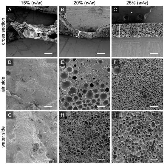 The initial PTMC-dMA concentration is crucial for homogenous porous scaffold formation. Scanning electron micrographs are shown for PTMC-dMA scaffolds prepared at room temperature for ten minutes with three PTMC-dMA concentrations. The top panels (A–C) show the cross sections with the air side facing upwards. The thickness is indicated by a vertical bar. The middle panels (D–F) show the air side, and the bottom panels (G–I) show the water side of the scaffolds. Scale bars are 200 µm. The asterisk (*) indicates the carbon tape used to stick the samples to the SEM stub.