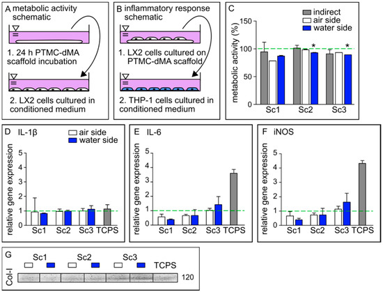 To investigate whether the porous membrane-based scaffolds induce an inflammatory response, the medium of LX2 cells cultured on the scaffolds was collected and used to culture human monocytes (THP-1) on TCPS. The conditioned medium of LX2 cells cultured on TCPS was used as a control. Gene expression relative to THP-1 cells cultured in normal growth medium was determined for IL-1β, IL-6 and iNOS, known to play an important role in inflammation [36] (Figure 5B,D–F).