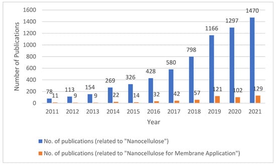 The number of publications (by year) in which the expressions “nanocellulose” and “nanocellulose + membrane” were seen in the title, keywords, or abstract in the last 10 years. These data were obtained from the database scopus.com (24 February 2022).