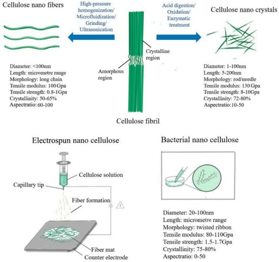 Before the production of nanocellulose, most cellulose should be isolated from untreated cellulose pulp that consists of lignin and hemicelluloses. Additional treating of the refined cellulose pulp is necessary for producing CNC/CNF. Generally, the majority CNFs and CNCs are generated by breaking down the cellulose fibers into nanosized fragments (by top–down approach), except for electrospun CNF and bacterial cellulose that employ the electrospinning method (bottom–up approach) and bacteria, respectively. In general, the manufacturing methods use different processes sequentially for producing different kinds of CNC/CNF which differ with respect to surface chemistry, crystallinity, and morphology []. The processes include chemical pretreatment, biological treatment, and mechanical disintegration. The appropriate methods applied for producing the nanocellulose from purified cellulose are examined in brief in the following section.