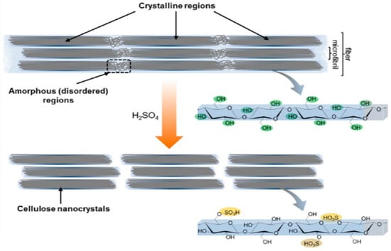Schematic representation of crystalline region and amorphous region in cellulose and the formation of cellulose nanocrystals. Reprinted with permission from Ref. []. Copyright 2014 American Chemical Society.