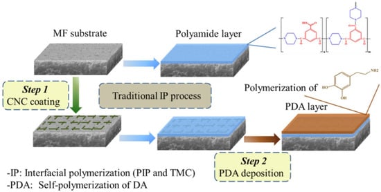 Diagrammatic representation of the CNC-TFC-PDA membrane preparation. Reprinted with permission from Ref. []. Copyright 2020 Elsevier B.V. All rights reserved.