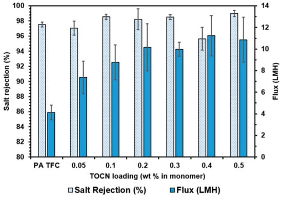 In a study by Smith and group [], the team fabricated 2,2,6,6-Tetramethylpiperidine-1-oxyl (TEMPO)-oxidized cellulose nanocrystals (TOCNs) modified RO thin-film nanocomposite membrane, and the best improvement was obtained by using the monomer dispersion method with 0.5 wt.% TEMPO-oxidized cellulose nanocrystals loading. The increased water flux and salt rejection data provided an evidence of improvement in the membrane performance when compared to the unmodified PA layer of pristine membrane. Water flux for TOCN modified RO membrane was 260% as compared with the unmodified one, and the salt rejection increased to 98.98 ± 0.41% from 97.53 ± 0.31%, as shown in Figure 7. The most important parameter that defines the formation of nanochannels and pore diameter is the strong amalgamation between TEMPO-oxidized CNCs and PA layer. Due to the presence of electronegative atoms, molecules can easily form hydrogen bonds [], and these hydrogen bonds provide strength and availability of nanochannels, whose dimensions can be altered by providing different conditions. Within this alteration, a significant number of hydrogen bonding reduced the nanochannel dimension, increasing the membrane’s salt rejection ability and resulting in high salt rejection at all loading levels examined in this study.