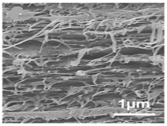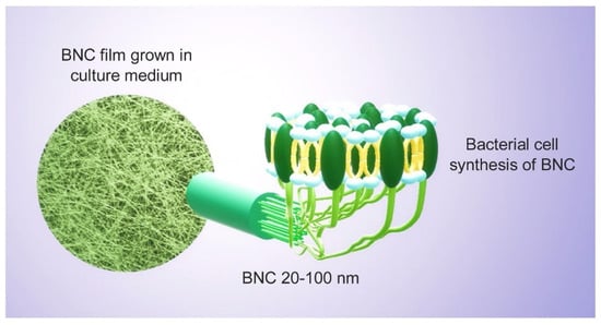 Bacterial nanocellulose can be synthesized using a two-step process called polymerization and crystallization. Glucose residues polymerize in the bacterial cytoplasm to form β-1,4 glucan linear chains, which are secreted extracellularly. The generated chains are crystallized into microfibrils, which are subsequently consolidated to form a very pure three-dimensional (3D) porous network of entangled nanoribbons with a width of 20–60 nm []. This is because of its exceptional chemical and physical stabilities, greener synthetic approach, low manufacturing costs, hydrophilic nature, and good degradability. Due to the aforementioned reasons, bacterial nanocellulose is gaining increasing global interest, and hence scientists are focusing more studies on the BNC-based materials [,]. In many applications, the ultra-fine structure (as shown in Figure 9) of BNC outperforms plant cellulose in terms of stiffness ], water interactive capacity, rate of polymerization, and active surface area [].