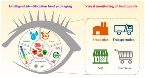 Food packaging is designed to guarantee the quality, health, integrity, and safety of food products, and is a system that coordinates the transportation, storage, and retail sale of food [4,5]. Food packaging plays a vital role in the food supply chain by acting as a protective layer against food pollution, but the main function of traditional conventional packaging is only to separate the food from the outside environment, and consequently, it cannot provide information about food spoilage [3]. Conventional methods for determining food spoilage, including physical and chemical testing, microbial characterization, and sensory evaluation, are inconvenient due to the disadvantages of cumbersome pre-treatments and operations, being time-consuming, and incurring high costs, which makes it difficult to achieve a non-destructive and rapid detection method for food quality [6]. Although the protective effect of food packaging can delay the spoilage of food to a certain extent, it is impossible to completely avoid the spoilage of food. Food undergoes many changes during the spoilage process, but it is difficult to assess in most cases, and intelligent packaging emerges as a present-day requirement. Intelligent packaging can sense, detect, and record changes on the outside or inside of products to deliver food safety and quality information to consumers [2].