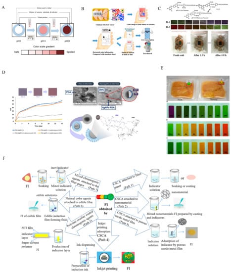 Several typical TTI and FI practical applications. (A) Working principle of enzyme time–temperature indicator in food packaging [11]. (B) Schematic of device application as food quality sensor [19]. (C) Intelligent color-changing paper with pH-sensitive chromophore packaging sensor [14]. (D) Using polydiacetylene/silver nanoparticles embedded in carboxymethyl cellulose [13]. (E) The food spoilage indicator that monitors the freshness of chicken breasts [16]. (F) Method of making FIs [2].