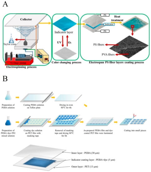 Gas indicator working principle. (A) Schematic drawing of 3D-printed preparation for an oxygen indicator, with the UV and oxygen causing the PS fiber layers to change color [21]. (B) CO2 indicator structure and related manufacturing process [31].