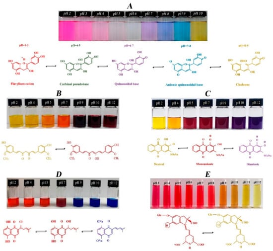 The color changes of (A) anthocyanin, (B) curcumin, (C) alizarin, (D) shikonin, and (E) betalains at different pH levels [3].