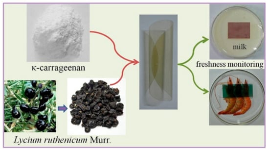 - Liu, J.R.; Wang, H.L.; Guo, M.; Li, L.L.; Chen, M.M.; Jiang, S.W.; Li, X.J.; Jiang, S.T. Extract from Lycium ruthenicum Murr. Incorporating κ-carrageenan colorimetric film with a wide pH–sensing range for food freshness monitoring. Food Hydrocolloid. 2019, 94, 1–10. [Google Scholar] [CrossRef]