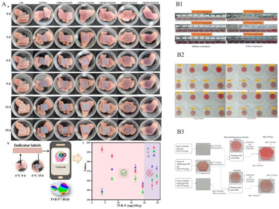The application of 3D printing in intelligent packaging. (A) The 3D printing of MA as a bioindicator film for dyes [37]. (a) Pictures of the indicator film stored at 4 °C; (b) schematic diagram of the method for assessing meat quality; (c) TVB-N results and RGB data for assessing the freshness of pork. (B) Principle of applying anthocyanin-P°CS gels for the 3D printing of intelligent food packaging indicators [38]; (B1) color of anthocyanin–PS gels before and after treatment (pH 2–10); (B2) anthocyanin–PS gels color change (pH 2 to 5 and PS 12.5–15%); (B3) design of the 3D-printed model.