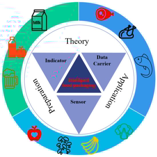 Intelligent packaging is currently divided into three main categories [3], including indicators (providing more convenience and food quality information for consumers), data carriers (storage, distribution, and traceability), and sensors (to quickly and efficiently measure food products). Intelligent packaging will occupy a large proportion of the food industry’s production in the future, with wide market prospects [8]. In this paper, we mainly summarize and outline the upcoming progress in the classification, preparation, and application of food packaging indicators. Equally, the feasibility of 3D printing for preparing intelligent food packaging indicators is also discussed, as are the limitations and future directions of intelligent food packaging.