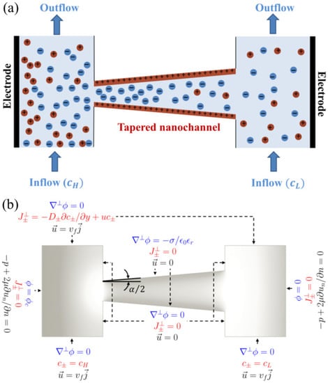Figure 1a illustrates a schematic of our computational domain. In the present analysis, a two-dimensional (2D) rectangular analysis is performed where the end (or depth) effects in a tapered nanochannel are not considered. Although a complete 3D model would be more accurate for realistic nanochannels and nanopores involving multiple nanosize dimensions, our 2D analysis is appropriate for simulating a planar nanochannel system where the third dimension length scale is much greater than the nanochannel height, such as the nanochannel array system simulated with a 2D model previously [9,67,68]. In contrast, typical nanopores are cylindrical confinements where axisymmetric analysis is more accurate and should be performed.