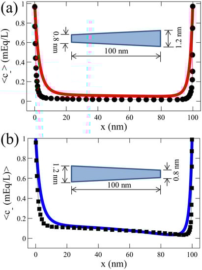 Validation of our numerical model of a tapered nanochannel by comparing the average anion concentration profiles () reported by Balannec et al. investigating pressure-driven ion transport through conical nanopores [73]. The geometries of the nanopores simulated are shown in the figure (not to scale), and the simulations were performed at constant surface charge density, −1 mC/m, and a solution concentration of 1 mEq/L (milli-Equivalent/Litre), as used by Balannec et al. The results from Balannec et al. for divergent and convergent nanopores are represented by ● in (a) and ◼ in (b), respectively. Our corresponding results are shown by — in (a) and — in (b).