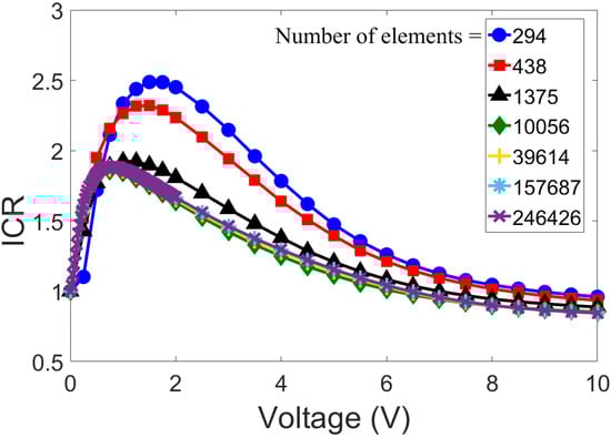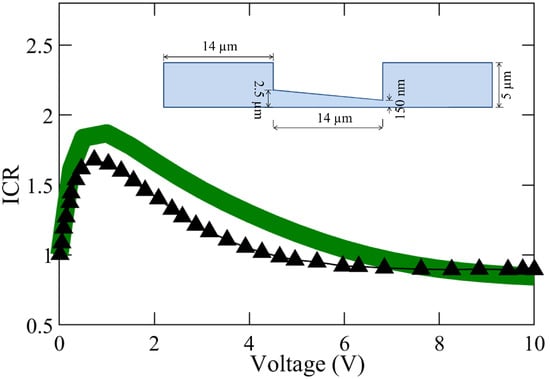 Shown in Figure 3 is further validation of our model performed with the results of ICR for different voltage bias, reported by Rosentsvit et al. [54]. The numerical simulations were conducted for the negative and positive voltage bias of the same magnitude, and the ICR factor was determined with the ratio of the corresponding current obtained via Equation (4) [54]: