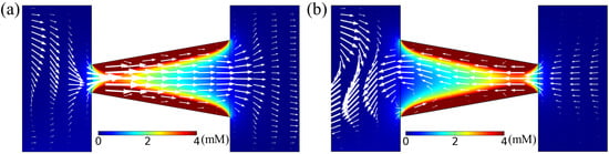 Anion concentration distribution (color map) and diffusioosmotic velocity profile (in arrows) for a nanochannel of length l = 100 nm and tip diameter = 20 nm for a tapered geometry of tilt angle = 15 (diverging) in (a) and = (converging) in (b). Here, = 7 m/s and = 0.14 mM.