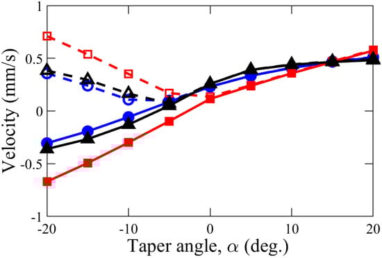 Variation of average velocity in x-direction (solid line) and velocity magnitude (dashed line) with angle of taper, , in a nanochannel of various length l and tip diameter : (i) l = 100 nm and = 20 nm (●), (ii) l = 100 nm, = 40 nm (◼), and (iii) l = 200 nm, = 20 nm (▲). Other control parameters were kept constant: = 0.14 mM, = 7 m/s, and = 0.01 C/m.