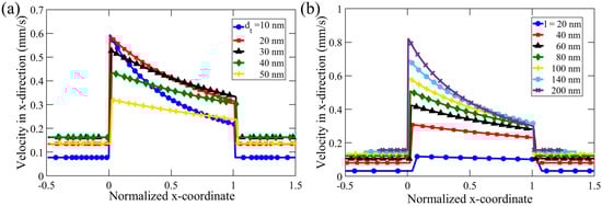 Average velocity in the x-direction along a nanochannel of constant cone angle, , inflow velocity, m/s, and concentration difference, mM to study the effect of (a) nanochannel tip diameter, , in the range 10–50 nm, with l = 100 nm, and (b) nanochannel length, l, in the range 20–200 nm, with nm. The x-coordinate is normalized with the nanochannel length, l.