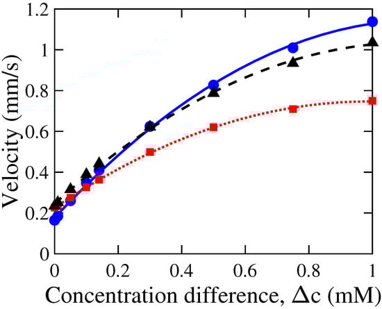 Variation in the magnitude of the average velocity, , with concentration difference, , in a nanochannel. Simulation results are shown for different parameters of nanochannel length, l, and tip diameter, : (i) l = 100 nm, = 20 nm (●), (ii) l = 100, = 40 nm (◼), and (iii) l = 200, = 20 nm (▲). The data points represent our simulation results, whereas the corresponding lines were obtained by a quadratic fit of these data points. Other control parameters were kept constant: = 10, = 7 m/s, and = 0.01 C/m.