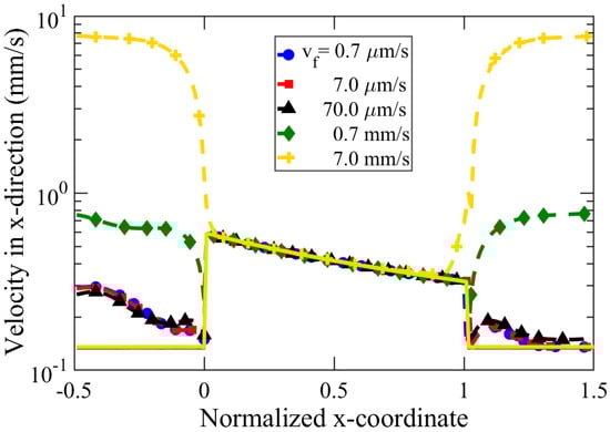 We studied the effect of inflow velocity, varying over five orders of magnitude in the range of 0.7 m/s–7 mm/s. The inflow velocity, , was kept equal for both the left (high concentration, ) and right (low concentration, ) reservoirs. Figure 9 reveals our simulation results of the diffusioosmotic flow velocity for various in a semi-logarithmic plot. For the range of flow velocities analyzed, the inflow velocities did not alter the flow pattern inside the nanochannel. A higher inflow velocity (e.g., = 7 mm/s) causes an increase in the y-component of DOF near the edges of the tapered nanochannel, illustrated in Figure 9 by the high value of the velocity magnitude. However, we observe the insignificant impact of the inflow rate on the DOF speed inside the tapered nanochannel, as the velocity in the x-direction and velocity magnitude matched with each other. Hence, the flow inside the nanochannel is dominated by x-directional flow, with an insignificant y-directional velocity component. Such an observation is likely due to our investigation in the low Peclet number regime (, where 7 mm/s, 50 nm, m/s). Here, higher flow velocity was not investigated, since such high flow velocities are difficult to implement and are rarely reported for micro/nano-fluidic experiments. In case of very high inflow velocity ( 7 mm/s) in Figure 9, we observed that a large reservoir inflow velocity could influence the DOF near the edges of the tapered nanochannel, which is manifested in terms of high-velocity magnitude near the nanochannel orifices.