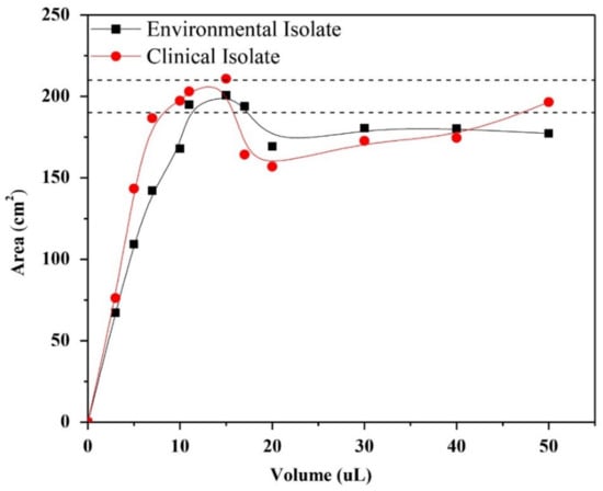 The lipid extracts associated to the external surface of the cell wall of the mycelial phase of H. capsulatum of the environmental and clinical isolates were prepared in chloroform in concentrations of 13.737 g/L and 9.277 g/L, respectively. The isotherms were then made from the lipid extracts, in incremental volumes from 3 μL to 50 μL. Given the lack of knowledge of the isotherm to represent the formation of monolayers of the lipid extract, a surface pressure of 5 mN/m was determined as a constant, and by drawing a base line at 5 mN/m, it was possible to evaluate the effect of the volume of the extract on the formation area of the monolayer. In Figure 2, it is shown that the lipid extracts in volumes between 5 and 20 μL reach the maximum monolayer area formed between 190 and 210 cm2.