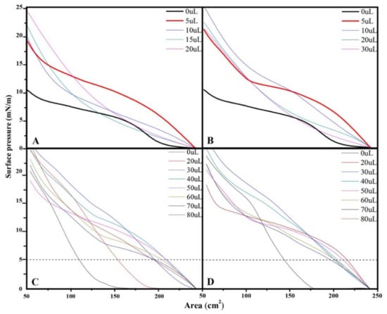 Surface pressure-area isotherms from the monolayer trough: (A); AmB (50 µL) with increasing volume of lipids extracts from environmental isolate; (B) AmB (50 µL) with increasing volume of lipid extract from clinical isolate; (C) environmental isolate extract (5 µL) with increasing volume of AmB; (D) clinical isolate extract (5 µL) with increasing volume of AmB. Concentrations are 13.737 g/L for environmental and 9.277 g/L for clinical extracts, respectively. The area values in Figure are given in cm2 (area occupied on the trough) because the molecular weight of the extracts is not known.