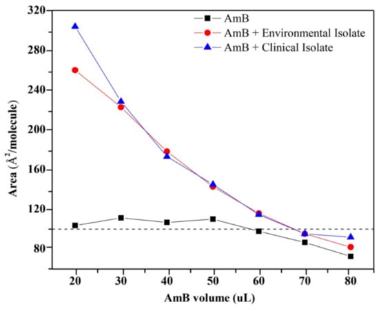 A surface pressure of 5 mN/m was determined as a constant, and by drawing a base line at 5 mN/m it was possible to evaluate the effect of the volume of amphotericin B on the area of the monolayer extracts at constant volume. In values greater than 50 µL, the AmB completely displaces the lipid molecules from the interface, presenting similar values to those of amphotericin in the absence of extracts (Figure 4).