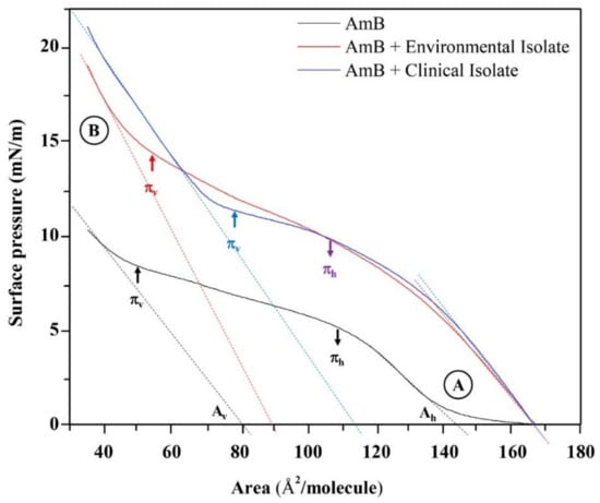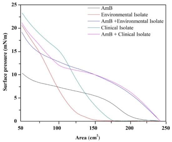 The surface pressure–area isotherms of the monolayers of AmB, of the lipid extracts associated to the external surface of the cell wall of the mycelial phase of H. capsulatum, and of the AmB/lipid extract mixed monolayers are shown in Figure 5. For the mixture of 50 µL of AmB with a concentration of 0.447 g/L with 5 µL of environmental lipid extract with a concentration of 13.737 g/L, there is a total volume of 55 µL with new concentrations of 0.406 g/L for AmB and 1.249 g/L for the environmental lipid extract, indicating an AmB mass/environmental lipid extract ratio of 1:3. For the mixture of 50 µL of AmB with a concentration of 0.447 g/L with 5 µL of clinical lipid extract with a concentration of 9.277 g/L, there is a total volume of 55 µL with new concentrations of 0.406 g/L for AmB and 0.843 g/L for the clinic lipid extract, indicating an AmB mass/clinical lipid extract ratio of 1:2.